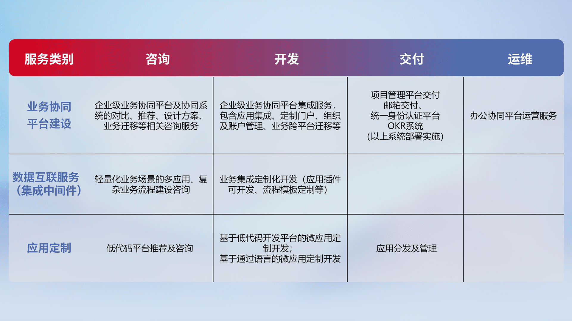 针对钉钉、、企微、、、、IDaas等平台级产品提供产品的规划、、方案、、交付、、、、定制化开发等服务,,实现如统一协同办公、、、、智能客户服务、、混合会议管理、、智能数据查询、、等业务场景,,实现数字化转型。。。。